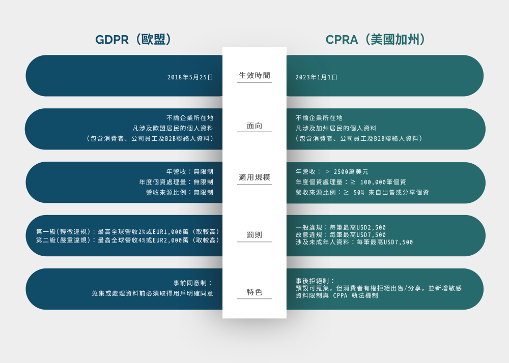 不論企業的實際所在地在哪裡[KC2],只要網站面向全球市場並可能涉及歐盟或美國加州居民的個人資料,即必須遵循 GDPR 與 CPRA 。這兩部法律皆採取「域外適用」的規範精神,強調只要企業的服務或產品觸及當地居民,就必須符合相關的隱私與資料保護要求。