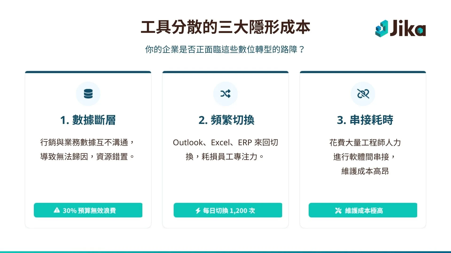 本文由長年深耕於B2B企業轉型 & 數位轉型顧問 Jika ,深入分析「工具分散」造成的隱形成本,並解析如何透過 All-in-One 整合平台消除資訊孤島,為導入 AI 做好準備。